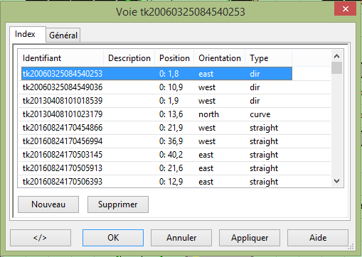 L'onglet Index de voies. Toutes les colonnes peuvent être triées en cliquant sur l'en-tête.