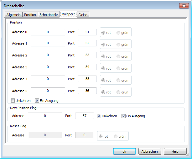 Wenn auf der Karteikarte 'Schnittstelle' der Typ multiport ausgewählt ist, sind die Felder "rot/grün" und "Reset Flag" deaktiviert.