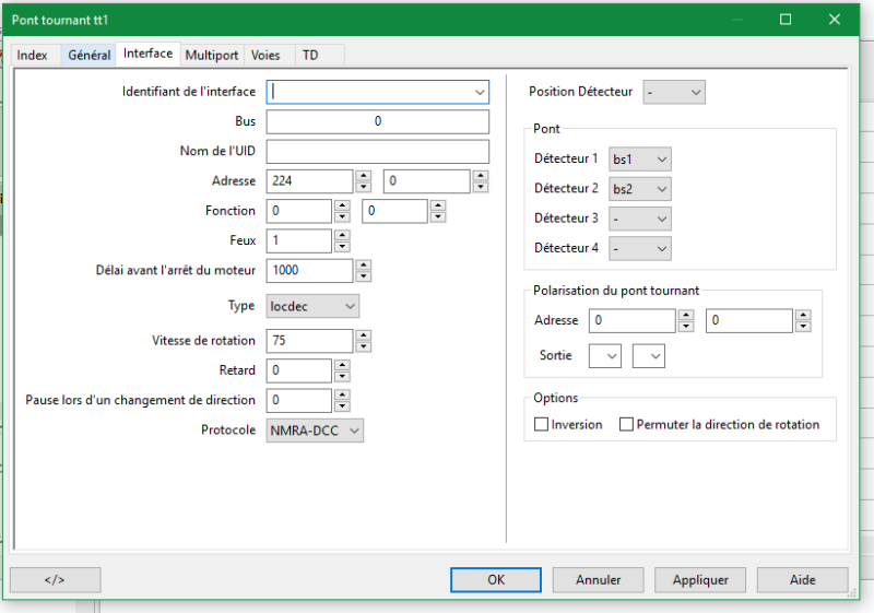 | Il doit être défini pour tous les ponts tournants dans le plan si au moins l'un d'entre eux utilise la bibliothèque DSD2010 Ce qui est nécessaire pour rapporter les bons évènements au bon pont tournant. |