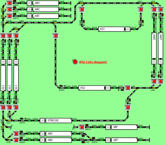 Im Plan aus dem vorigen Abschnitt wurden sämtliche Abstellgleise (AB1-7) sowie die Ausfahrt des Schattenbahnhofes (SBF) mit der Ein-Taster-Methode realisiert, da diese immer in Gleis 3 enden.