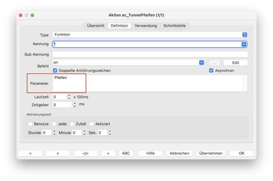 Es wird die Funktions-Beschreibung "Pfeifen" als Parameter verwendet, um nicht für jede Lok an eine bestimmte Funktions-Nummer gebunden zu sein.