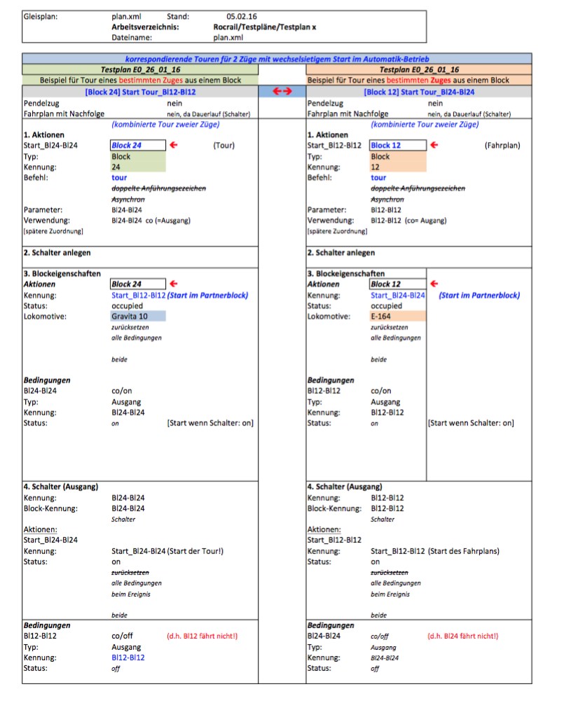 Die Zusammenhänge zwischen den anzulegenden Aktionen, Anlegen eines Schalters, Eintrag von Aktionen in den Blockeigenschaften mit den notwendigen Bedingungen und die Einstellungen des angelegten Schalters (= Ausgang) ist in der nachfolgenden Übersicht dargestellt. Sie zeigt auf einfache Weise die 4 Bereiche für beide Touren (Gegenüberstellung) und macht auf die Einzelheiten aufmerksam, die einzustellen sind.
