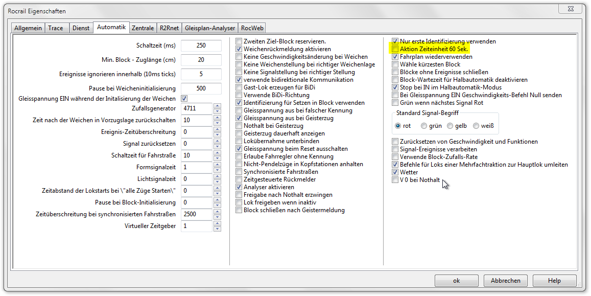 Damit Rocrail Sekundengenaue Aktionen ausführen kann, muss in den Rocrail-Eigenschaften folgendes Häkchen entfernt werden: