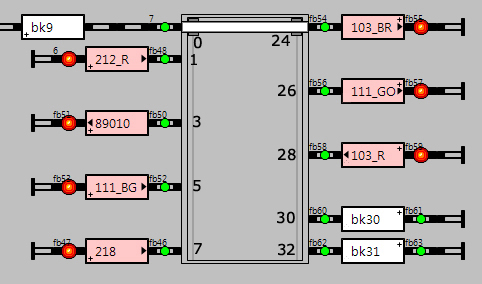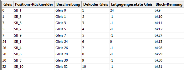 Last specific configuration are the tracks. The Märklin transfer taible only has 2 opposite tracks and the rest is offset. To realize a possible best presentation and that all tracks will be reached correct, a special order of tracknumbers is needed. In Rocrail the transfer taible is based on a turn table. Through this the Rocrail trac 0 is opposite of Rocrail trac 24, etc… This results in following assignment: left side contains tracks 0, 1, 3, 5 7, and right side contains 24, 26, 28, 30, 31.