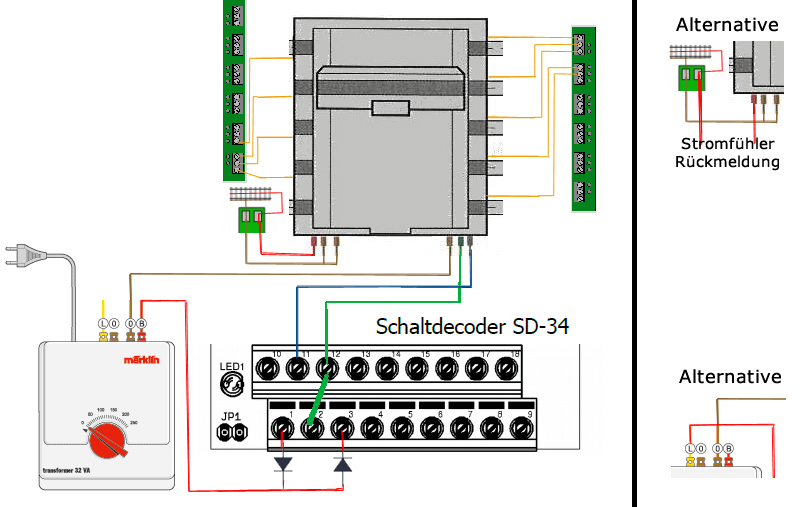 - Therefor connectors 1 and 3 have to be connected with blocking diodes to connector "B" of the Märklin transormer as shown in the picture.