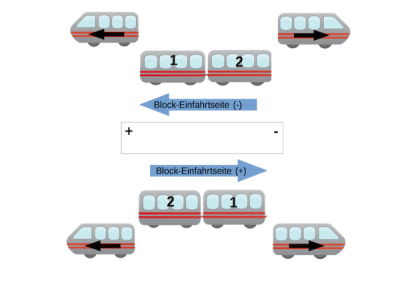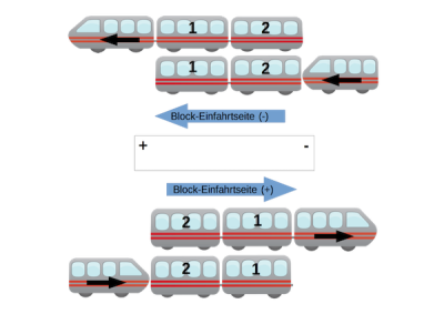 Die Betrachtung erfolgt über die Block-Einfahrtseite. Dabei ist es unerheblich, ob eine Lok schiebt oder zieht. Über die Einfahrtseite betrachtet bleibt der erste Wagon der „Erste“ und der letzte Wagon der „Letzte“.