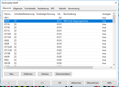 Der in der Übersicht an erster Stelle stehende Rückmelder "FB11" ist nicht Teil der RS-Bus Rückmeldung (über die Lenz-Zentrale) sondern ist über eine externe Funkverbindung via WIO (Erste Schritte mit WIO) mit dem Rocrailserver verbunden. Er ist hier noch nicht mit der einer Adresse versehen.