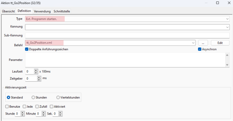 - Als Befehl den Namen des xml-Scripts eintragen. Auch dafür eine aussagekräftige Bezeichnung wählen (z.B. tt_Go2Position.xml)