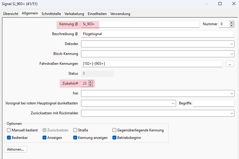 - Block-Kennung und Fahrstraßen-Kennungen können eingetragen werden, damit das Signalsymbol im Gleisplan entsprechend ausgeleuchtet wird