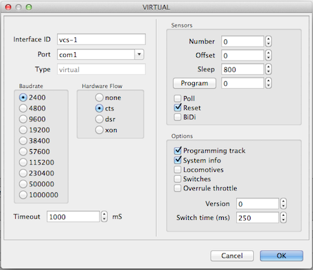 Het virtuele CS is de standaard configuratie als Rocrail opgestart wordt.