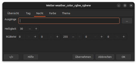 Die Farb-Tabelle bietet die RGBWWbsC-Werte für jede halbe Stunde des Tages.