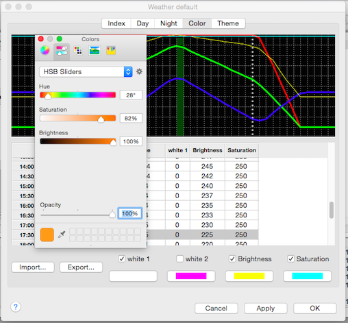 The color table provides a RGBWWbsC value for every half hour of the day.