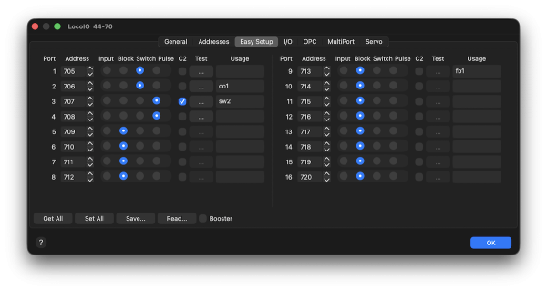 The I/O can be configured on the LocoIO Easy Setup tab: